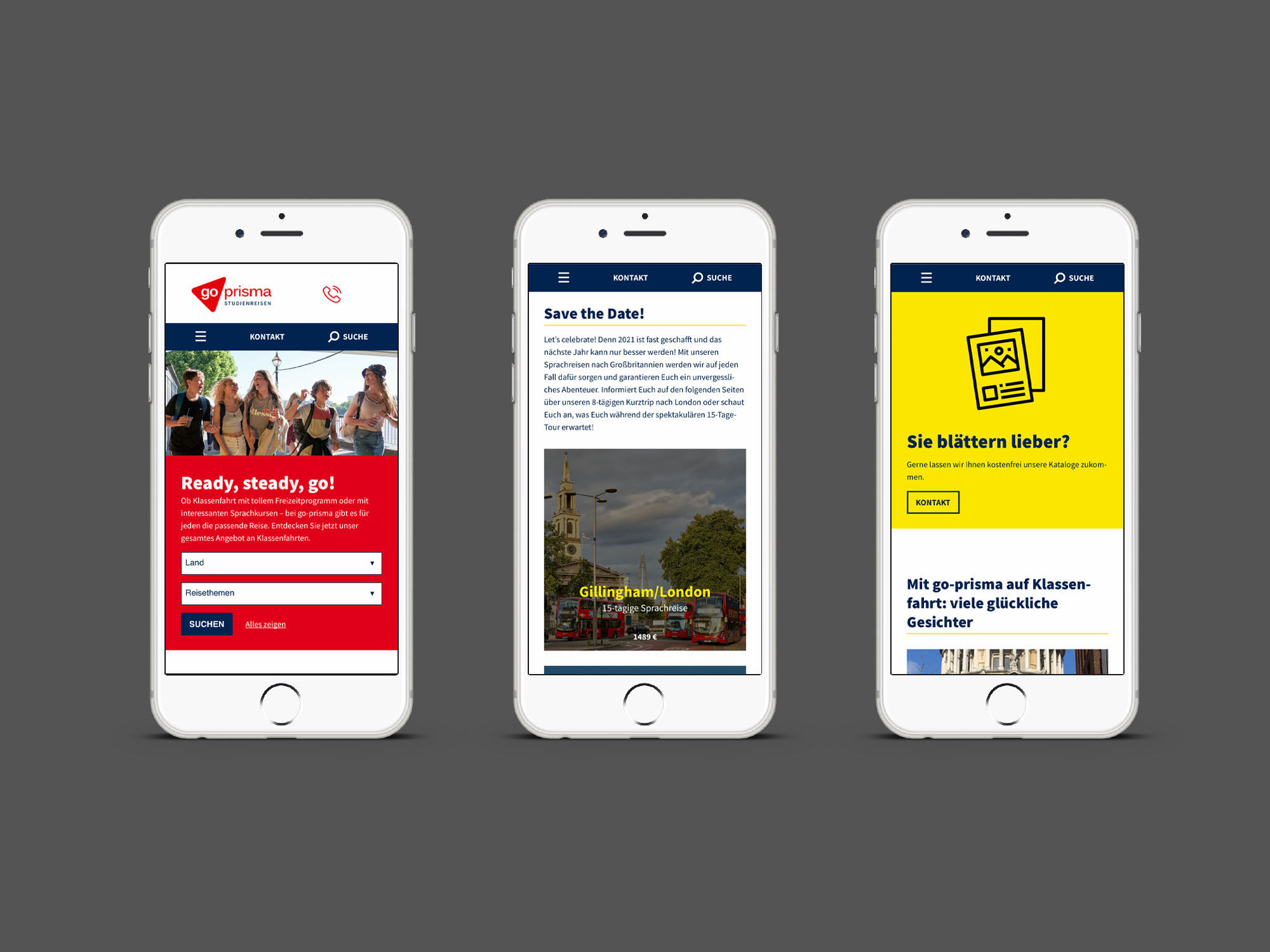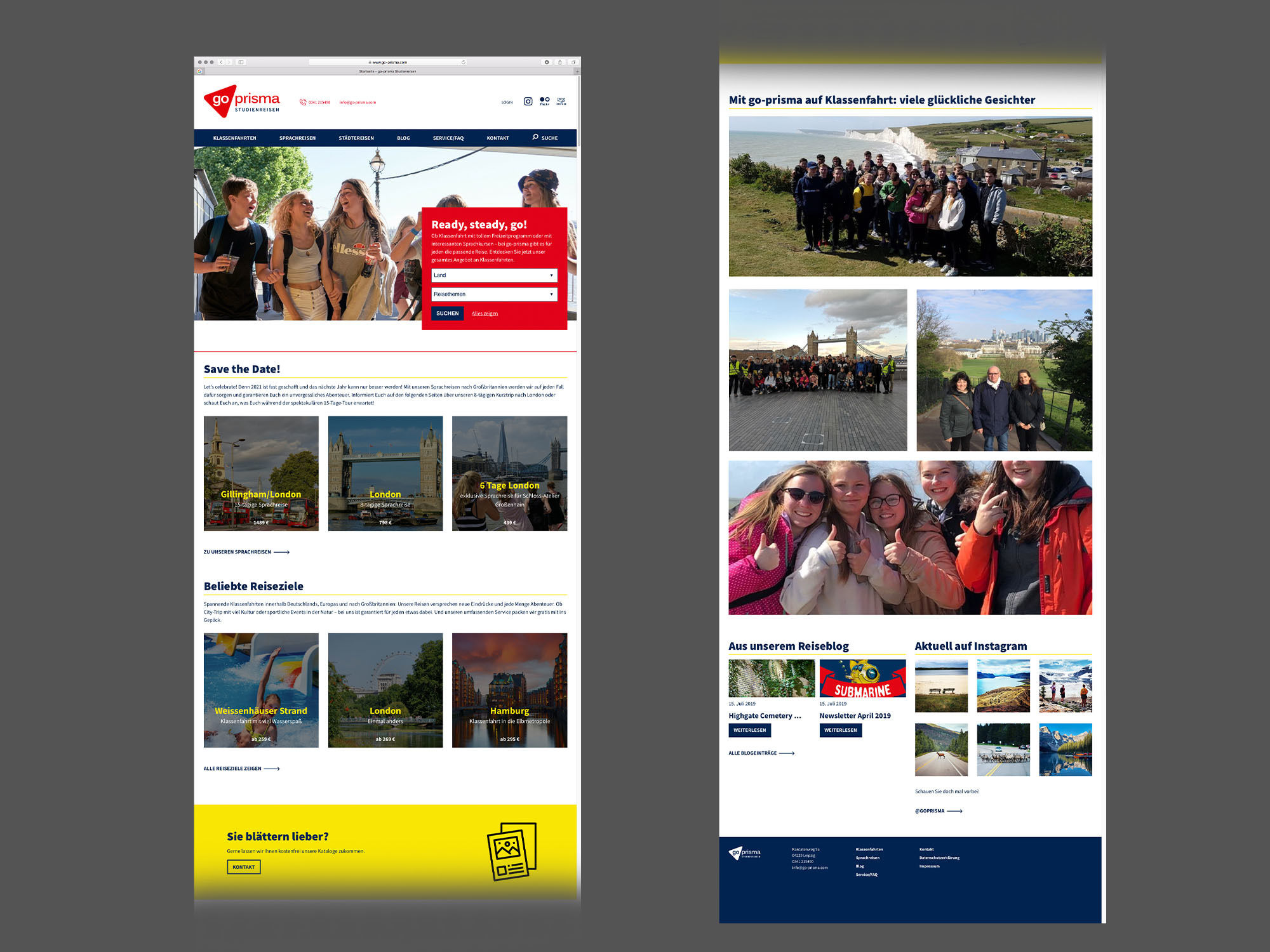 Go-Prisma ist ein Veranstalter für Sprachreisen sowie für Klassenfahrten innerhalb Deutschlands, nach Großbritannien und quer durch Europa. Schon auf der Website haben wir Fernweh mit einprogrammiert. Auf diversen Länder- und Städteseiten gibt es allerhand zu entdecken, dabei überzeugt jedes Reiseziel durch eine klare Struktur und vielversprechende Fotos. Im selben Schritt wurde das Logo grundlegend neu gestaltet: als eine Art visueller Heimathafen, von dem aus man in die Welt ziehen kann. Let’s go!