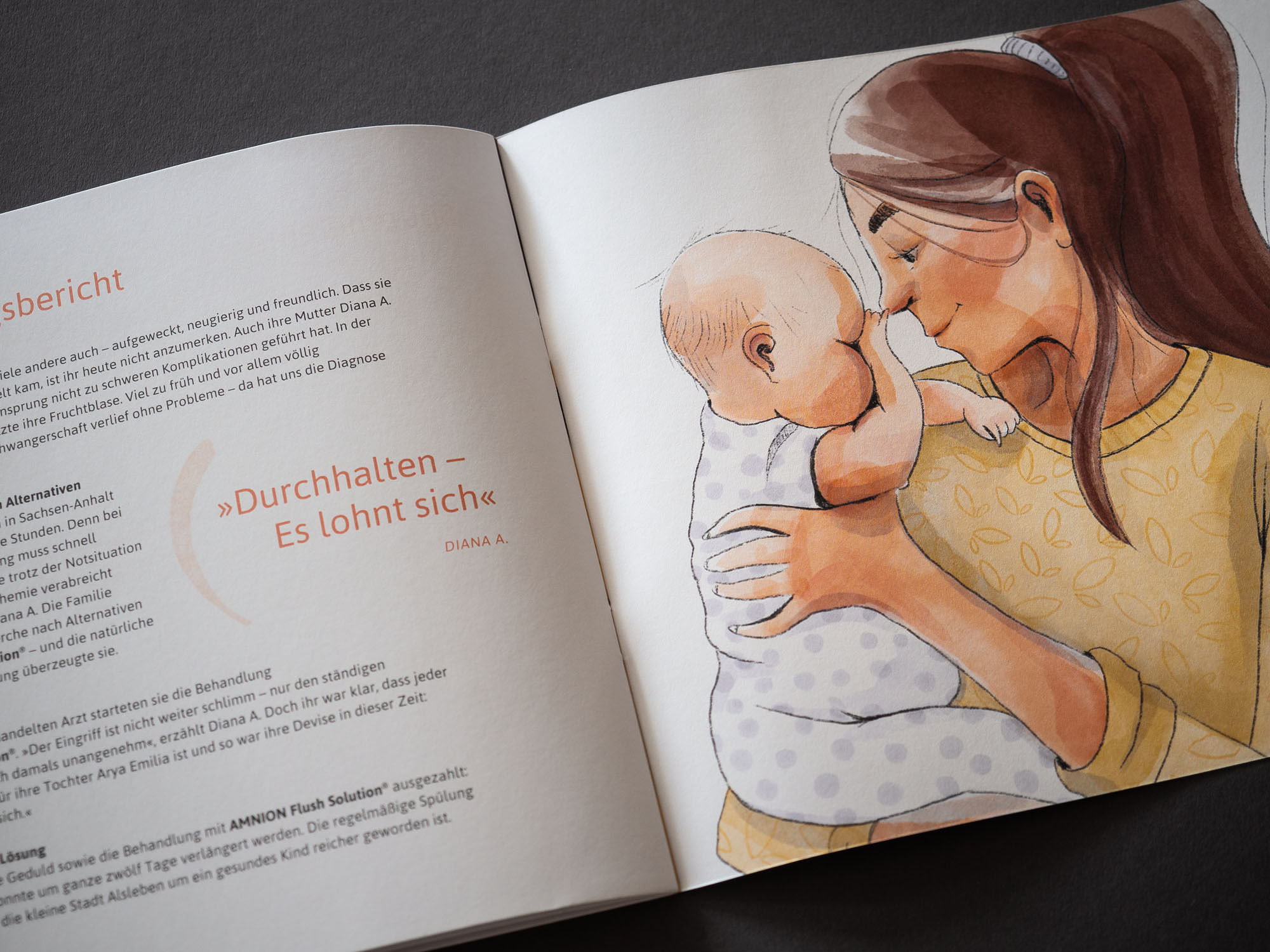 Ein Projekt, das im Herzen berührt: Die Mortalität von Embryos bei einem vorzeitigen Blasensprung kann durch diese neuartige Behandlungsmethode drastisch reduziert werden. Neben diversem Material für den Fachbereich des Serumwerks sollte es auch eine Broschüre für die Patientin selbst geben. Ein emotional-sensibles Thema wird hier in einer weichen Anmutung durch Farbe, Form und Illustration verständlich gemacht.