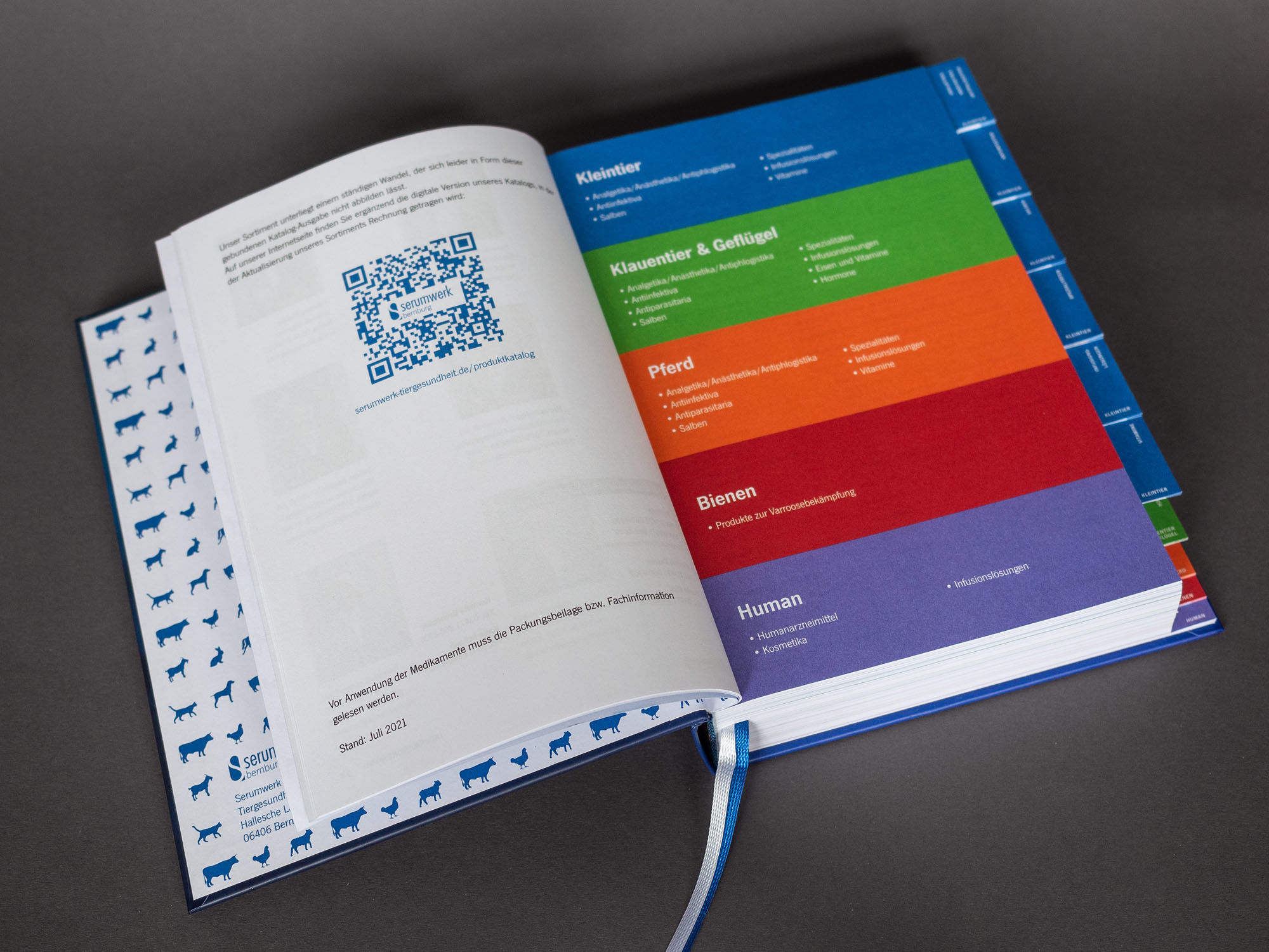 Ist es eigentlich okay, Tiere auf den Index zu setzen? Nun, in der (veterinärmedizinischen) Praxis ist es tatsächlich eine feine Lösung, denn durch den attraktiven Stufenschnitt des Katalogs kann der Tierarzt die Medikamente auch offline gezielt finden. Deshalb wurden bei diesem Projekt wirklich alle Register gezogen und die Produktbereiche mit einer Mehrfachstanzung übersichtlich aufgefächert. Wir geben zu, dass wir die Druckproduktion dabei ordentlich zum Schwitzen gebracht haben – aber letztlich auch die Augen unseres Kunden zum Glänzen.