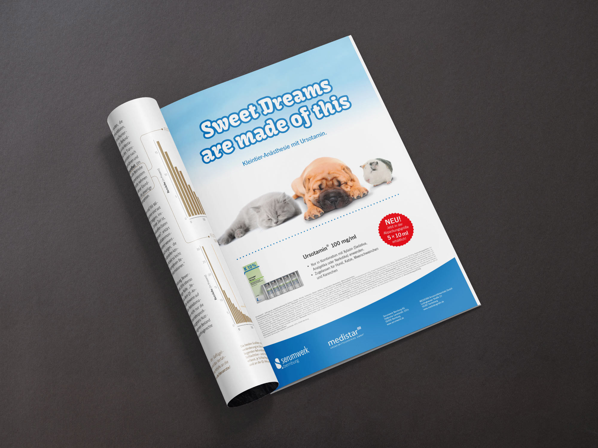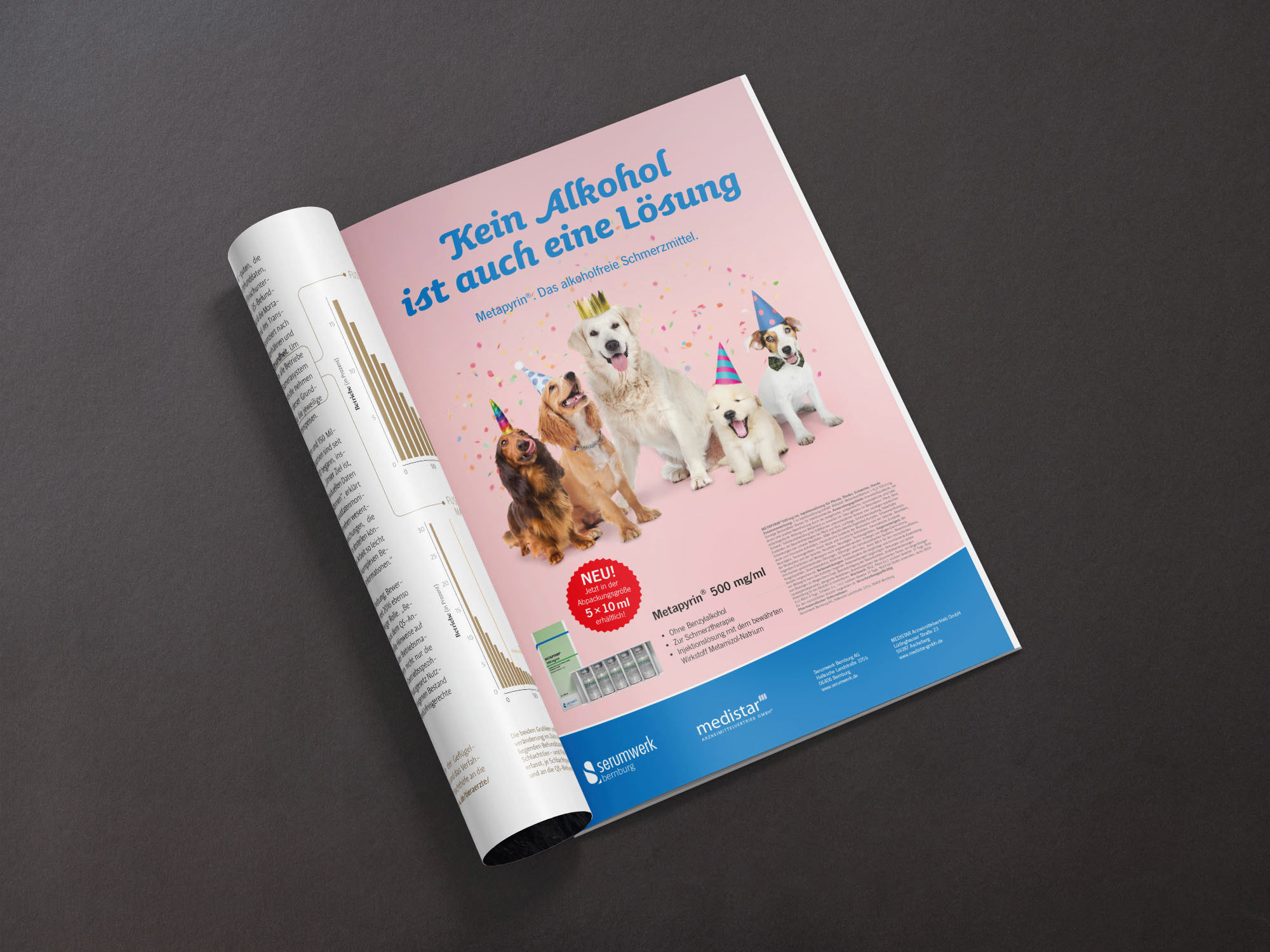 Über Krankheit sollte man nicht scherzen, aber Medikamente dürfen mit etwas Werbehumor den Genesungsprozess auch schon vorzeitig unterstützen. Ob Alkoholabstinenz bei Hunden, Energydrinks für Schweine oder Medizin nach Noten – wer heilt, hat Recht, und wer wirbt, hat Spaß. Zu Risiken und Nebenwirkungen fragen Sie bitte Ihren Tierarzt.